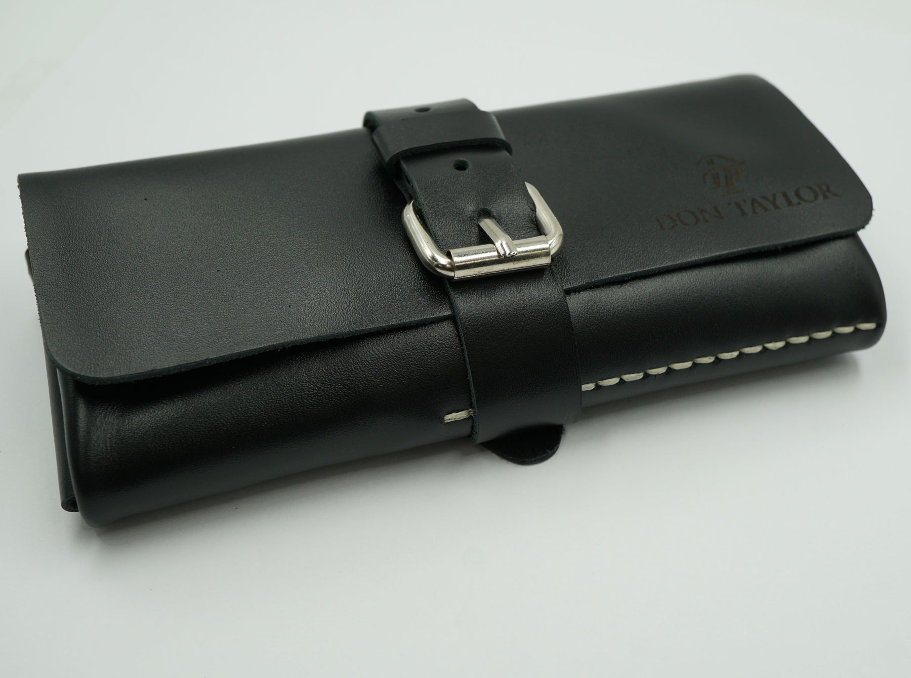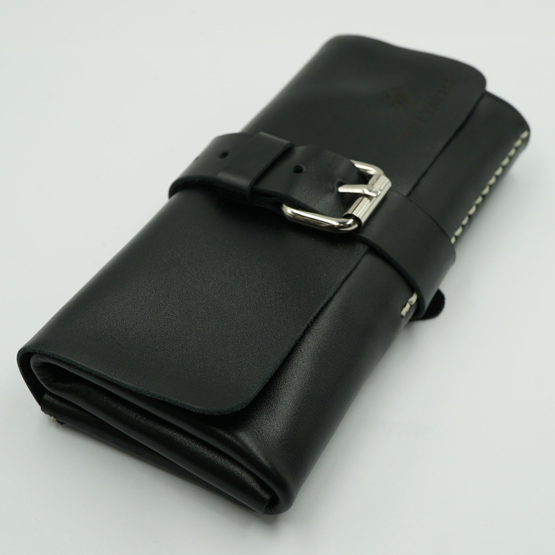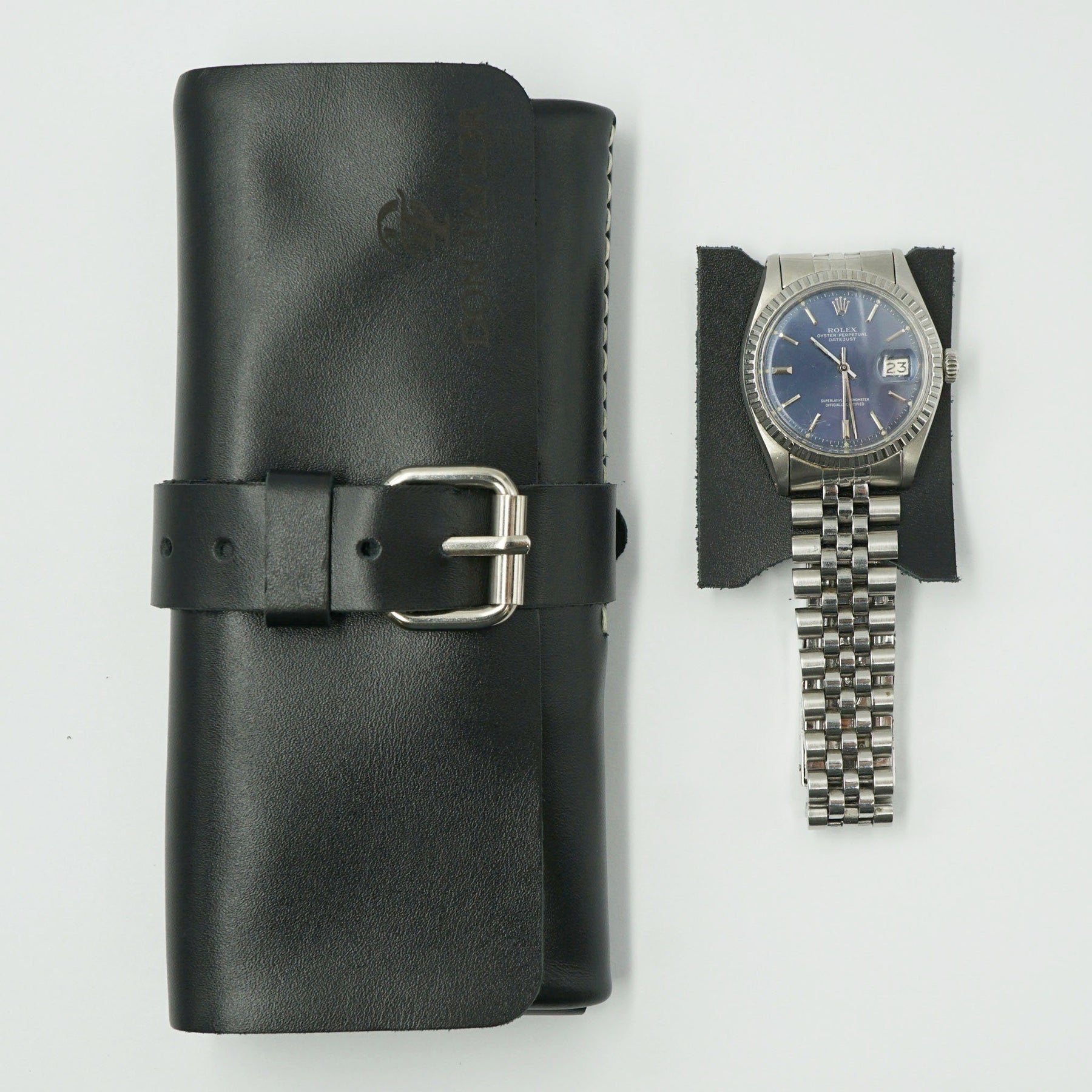 This handcrafted leather watch roll is perfect for traveling or just safely storing it at the end of the day. This model of a roll easily develops without leaving folds. Your watch does not touch the metal. Top cover securely holds items in your pockets, even with strong shaking. Each roll is hand-stitched and therefore is unique and can vary slightly in color and dimensions. Holds 3 Watches