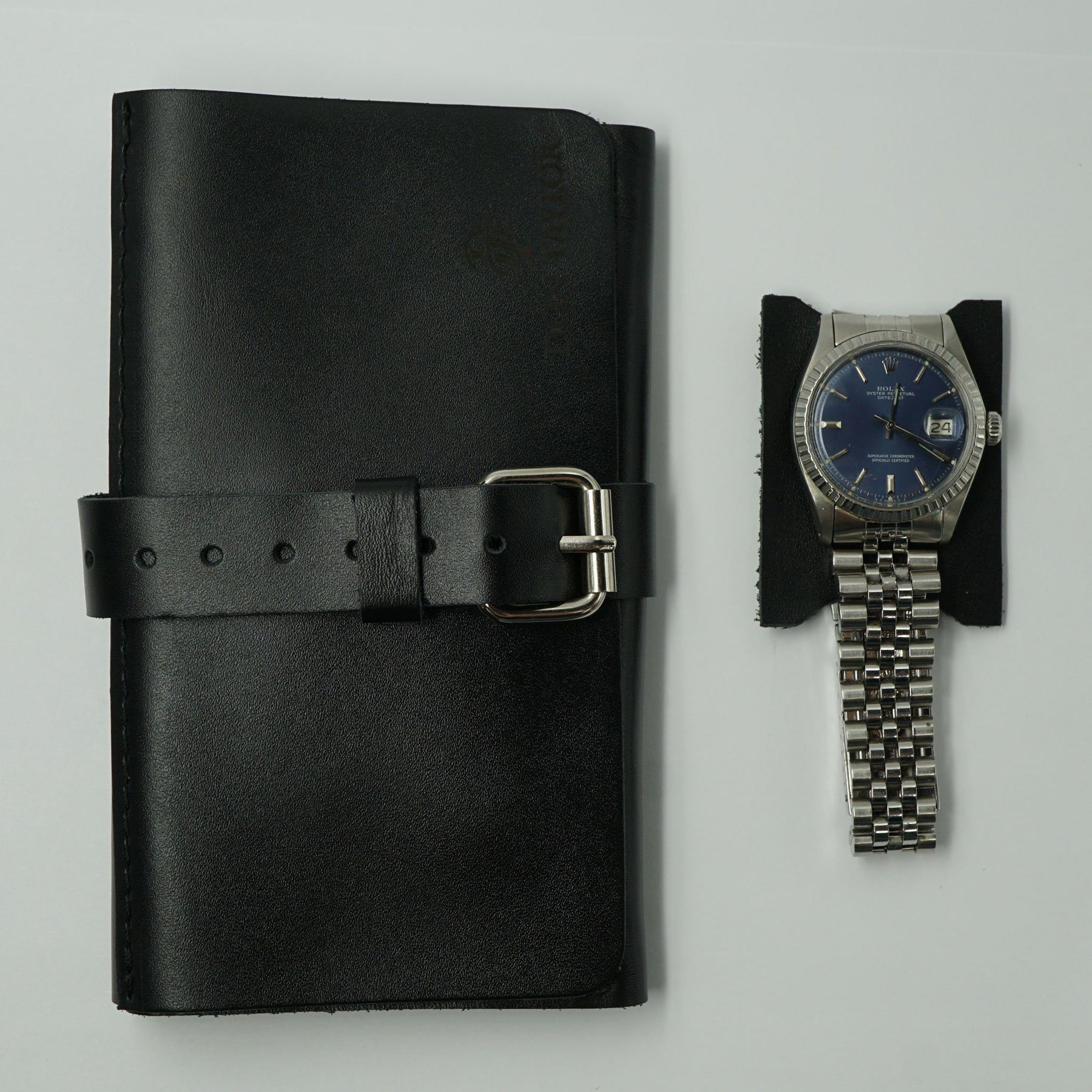 This handcrafted leather watch roll is perfect for traveling or just safely storing it at the end of the day. This model of a roll easily develops without leaving folds. Your watch does not touch the metal. Top cover securely holds items in your pockets, even with strong shaking. Each roll is hand-stitched and therefore is unique and can vary slightly in color and dimensions. Holds 3 Watches. Wide pockets which makes it perfect for medium to larger watches.