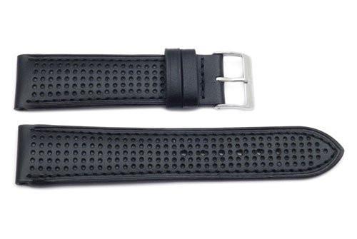 Total watch repair offers a full line of premium quality ALFA replacement watch bands. The strap features genuine black leather, holes to prevent the band from retaining sweat, anti-allergic, matte finish, thick padding, regular length, and matching stitching around the band for durability.