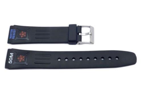This Black resin watch strap is the perfect replacement watchband for nearly any watch. The band features the same style as popular diver bands with a matte finish, silver tone buckle, and water resistant materials. This sporty strap also contains a small red star encased in a matching circle. Regular length universal replacement band made by Bandenba for size 20mm watches.