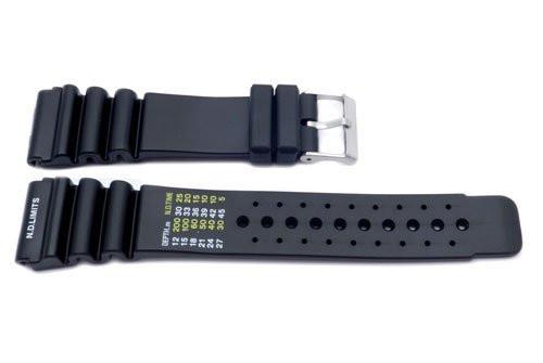 Bandenba manufactured this Citizen style watch band to fit most any timepiece regardless of brand. The thick watch strap features a sturdy black plastic band, a silver tone buckle, and water resistant materials. The wind ND measurements (in meters) give this band a distinctive Diver's feel. Extra heavy construction includes a matching mock wood textured bottom for enhanced durability. Regular length universal replacement strap in size 24mm.