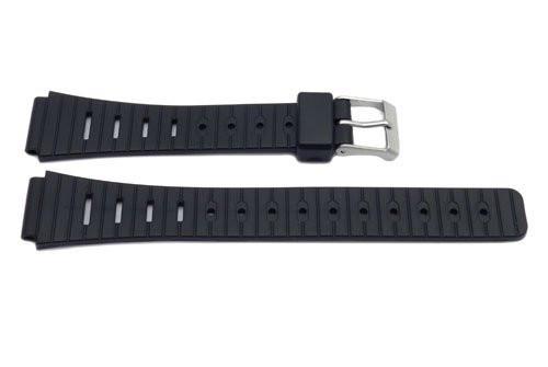 This watch band by Bandino is designed to fit  most watches regardless of brand. The black strap is made of smooth, yet durable resin. The resin material features lightweight slimline construction along with a sleek silver buckle.  This sporty accessory features a Casio style design with vertical stripes, no padding for extra flexibility, and a subtle matte finish. Water resistant materials make this piece suitable for daily wear. Regular length band is best suited for smaller watches and comes in size 14mm.