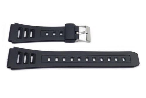 This watch band by Bandino is designed to fit  most watches regardless of brand. The black strap is made of smooth, yet durable resin. The resin material features lightweight slimline construction along with a silver tone stainless steel buckle.  This sporty accessory features a Casio style design with 3 ventilation slits where the band meets the watch case, no padding for extra flexibility, and a subtle matte finish. Water resistant materials make this piece suitable for daily wear.