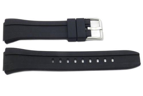 This watch band by Bandino is designed to fit most watches regardless of brand. The black strap is made of a durable rubber. The rubber material features lightweight slimline construction along with a sleek silver tone stainless steel buckle. This sporty accessory features no padding for extra flexibility, and a subtle matte finish. Water resistant materials make this piece suitable for daily wear. Regular length mens band comes in size 18mm.