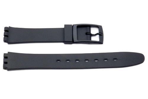 This watch band by Bandino is designed to fit most watches regardless of brand. The black strap is made of a durable smooth rubber. The rubber material features lightweight slimline construction along with a black plastic buckle.  This sporty accessory features no padding for extra flexibility, and a subtle matte finish. Water resistant materials make this piece suitable for daily wear. Regular length ladies band comes in size 14mm.
