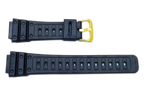 This Genuine Factory CASIO Black Resin watch band features a Gold Tone Buckle. The watch strap measures 26mm that integrates to the caseback at 18mm. This watch strap is water resistant. Regular length.