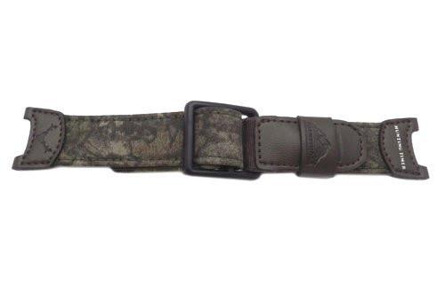 This Genuine Casio Camouflage Cloth and Nylon Pathfinder Series 24mm watch band features a black plastic buckle, a matte finish, regular length, and water resistance.