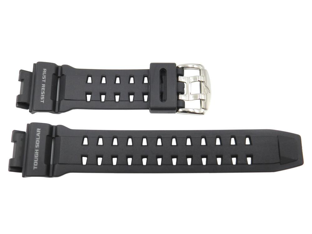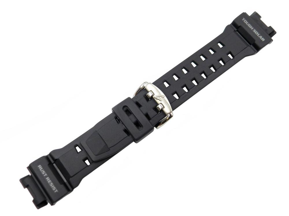 This Genuine Factory Casio Black Resin watch band features a silver tone stainless steel buckle, matte finish, and water resistance. This Casio strap is meant and designed for Casio G-Shocks and measures 26mm that integrates to the case-back at 16mm. Color Black. Regular Length.