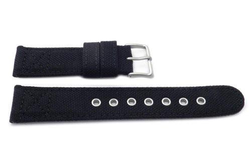 The military-inspired black strap features a tough nylon surface with a black textured leather bottom. Matching stitching and medium padding give this sporty accessory a streamline appearance. The silver tone stainless steel buckle complements the large steel holes, which also provide a secure fit. Water resistant materials make this band suitable for any outdoor adventure. Regular length strap comes in Men's size 22mm. Although the band corresponds to case back numbers BM-8475-34E, it will fit most Citizen timepieces with 22mm lugs. All of our Citizen bands are 100% Authentic. Regular length.