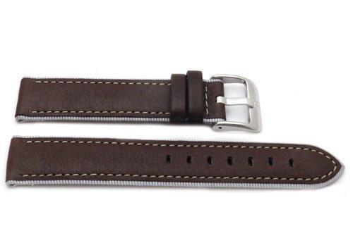 Total watch repair offers a full line of premium quality ALFA replacement watch bands. The strap features genuine textured leather, anti-allergic, matte finish, thick padding, regular length, grey nylon lining, and white contrasting stitching around the band for durability.