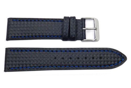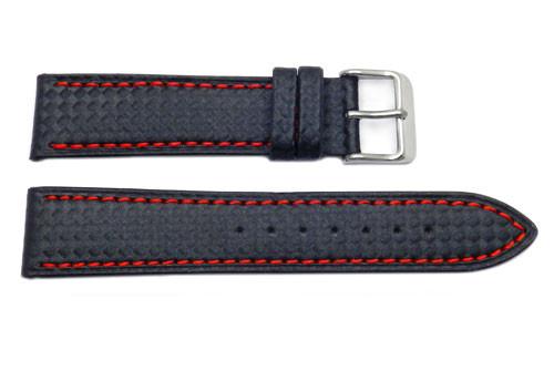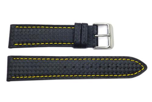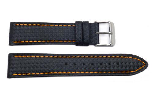 This sporty watch band is a black carbon fiber style leather watch band with color contrasting stitching. The watch band features a matte finish, heavy padding, and water resistance.