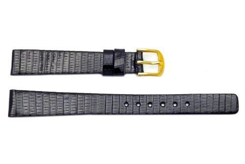 This authentic Seiko replacement band will fit any 13mm lug width watch. The black strap certainly fits the dressy description with its exquisite genuine lizard texture and gloss finish. Thin padding ensures comfort while the striking gold tone stainless steel buckle maintains the formal appearance. Regular length.