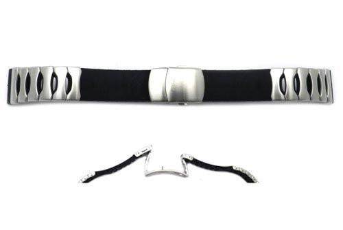 Seiko manufactured this replacement strap for several timepieces. This black genuine rubber band features a smooth surface with stainless steel pieces on both ends. The curved shape makes for an integrated appearance. As an added bonus, this semi-formal accessory is made with water resistant materials, so it's suitable for outdoor excursions as well as the office. The silver tone stainless steel butterfly clasp holds your watch in place while the squeeze closure mechanism provides quick release. The regular length band comes in Men's size 19mm, although the width appears larger due to the design.