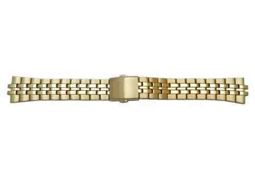 This genuine Seiko gold tone push button fold over clasp watch bracelet has a unique style. It features an all around brushed finish with polished finish in the middle. Clasp closure mechanism is engraved 'SEIKO' for authenticity. This watch bracelet is water resistant. Regular length.
